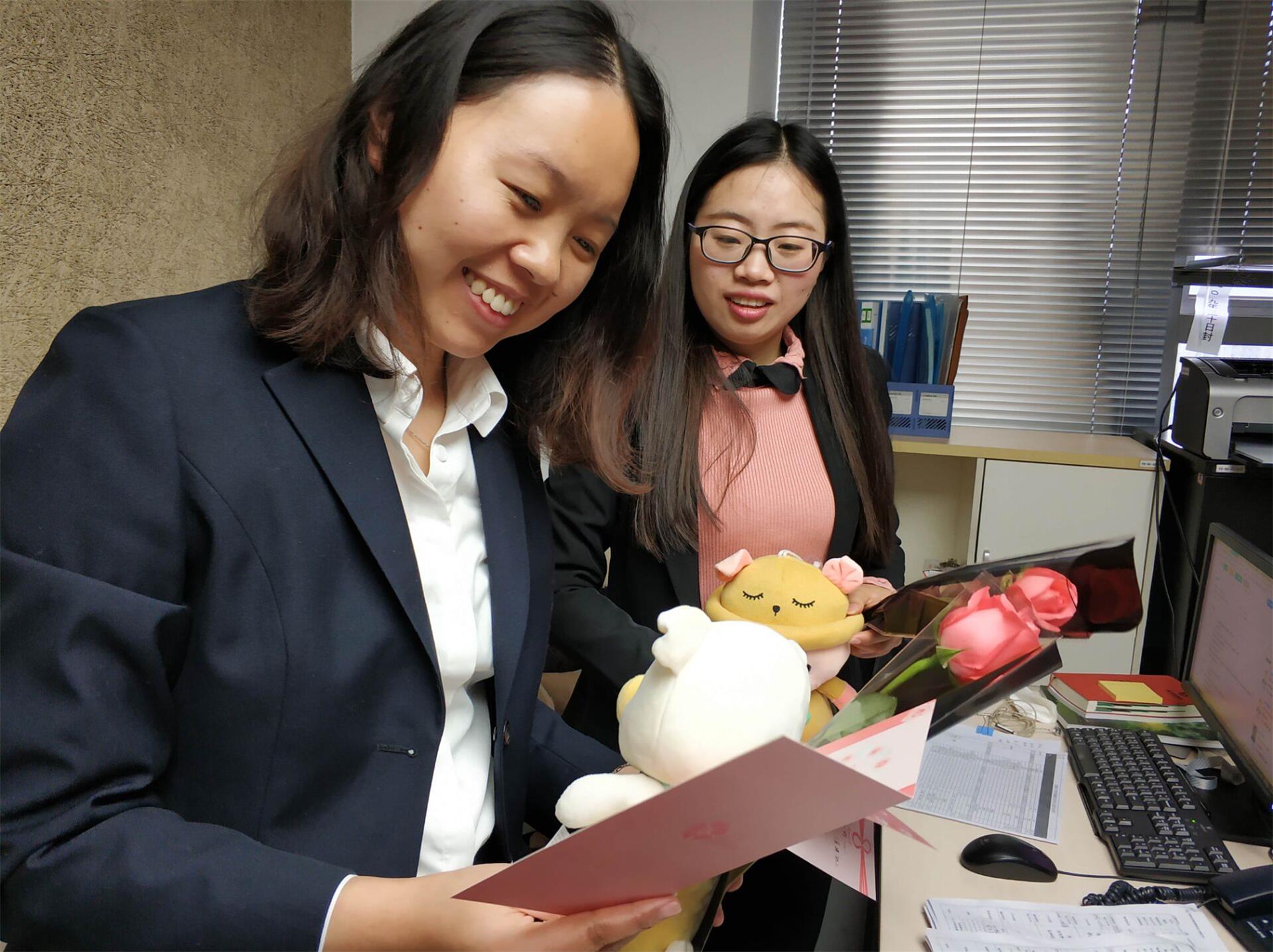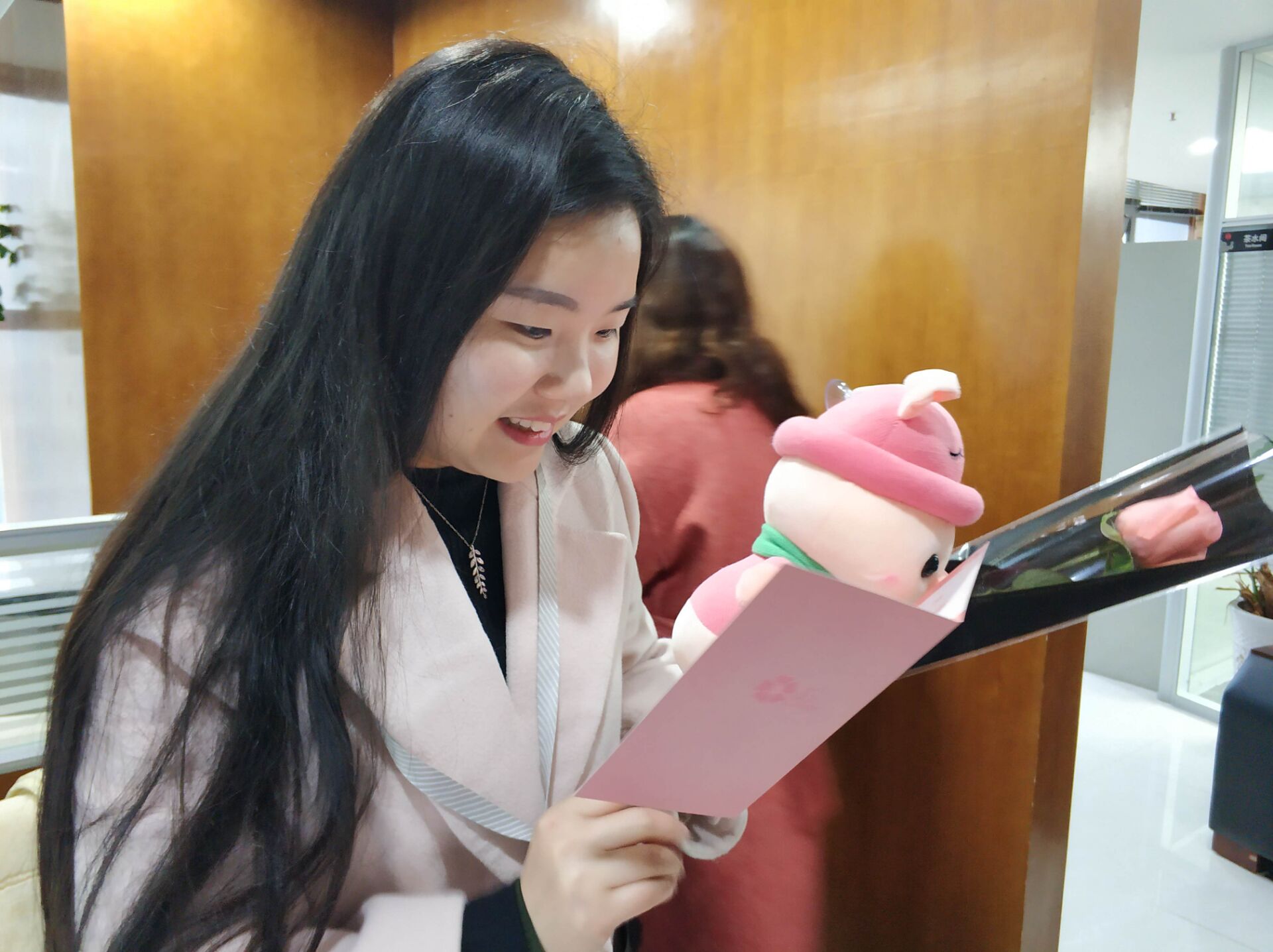 此次三八婦女節活動,公司為女職員們精心準備了節日賀卡、玫瑰花以及豬年吉祥物,而這些禮物都帶著公司誠心誠意的祝福,每張賀卡上依據每一位女職員的個性特征親筆寫上了對她的祝福;玫瑰花則是帶著三月的絢爛,希望每一位女職員如花般美麗的綻放;而豬年吉祥物寓意便是恭祝每一位女職員在新的一年里諸事順遂、萬事大吉。此次活動公司還選派了三名男同事作為“護花使者”親自將我們的節日禮物,暖心的送到每一位女職員手中,企劃部的同事們也精心的拍下了他們每一位的幸福時刻,制作了溫馨的小視頻慶祝三八婦女節。這些小驚喜都凝聚在她們的笑臉上,這一刻便是最美好的回饋。