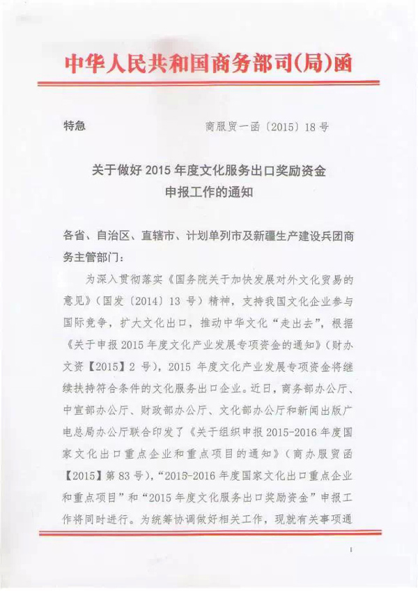 為深入貫徹落實《國務(wù)院關(guān)于加快發(fā)展對外文化貿(mào)易的意見》(國發(fā)【2014】13號)精神,推進中華文化“走出去”,商務(wù)部、中宣部、財政部、文化部、新聞出版廣電總局將組織認定2015---2016年度國家文化出口重點企業(yè)和重點項目?,F(xiàn)將有關(guān)事項通知如下: