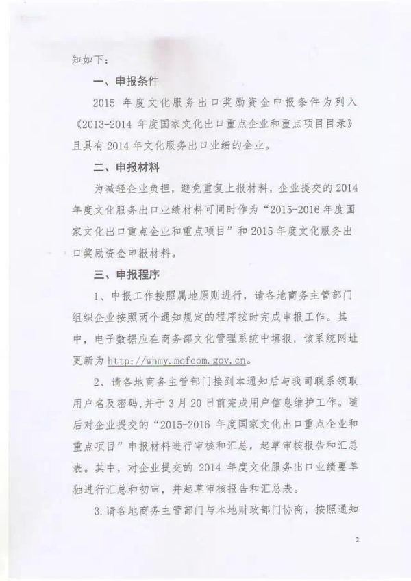 一、請積極組織符合條件的企業(yè)和項目進行申報。重點企業(yè)的申報標準請參照《文化產(chǎn)品和服務(wù)出口指導(dǎo)目錄》(商務(wù)部公告2012年第3號)中的重點企業(yè)標準。重點項目的范圍包括:文化出口公共服務(wù)平臺;文化產(chǎn)業(yè)境外投資和合作項目;入選國家、世界非物質(zhì)文化遺產(chǎn)等名錄并實現(xiàn)出口的文化項目;其他具有代表性的項目;